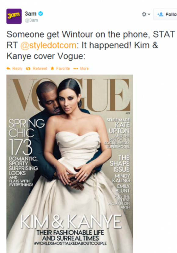 Kim kardashian and kanye west took the fashion industry by storm on friday, march 21, when they were fellow conde nast publication vanity fair , meanwhile, poked fun at the magazine's cover line, #worldsmosttalkedaboutcouple, tweeting , kim and kanye land 'vogue' cover, nearly upstaged by.